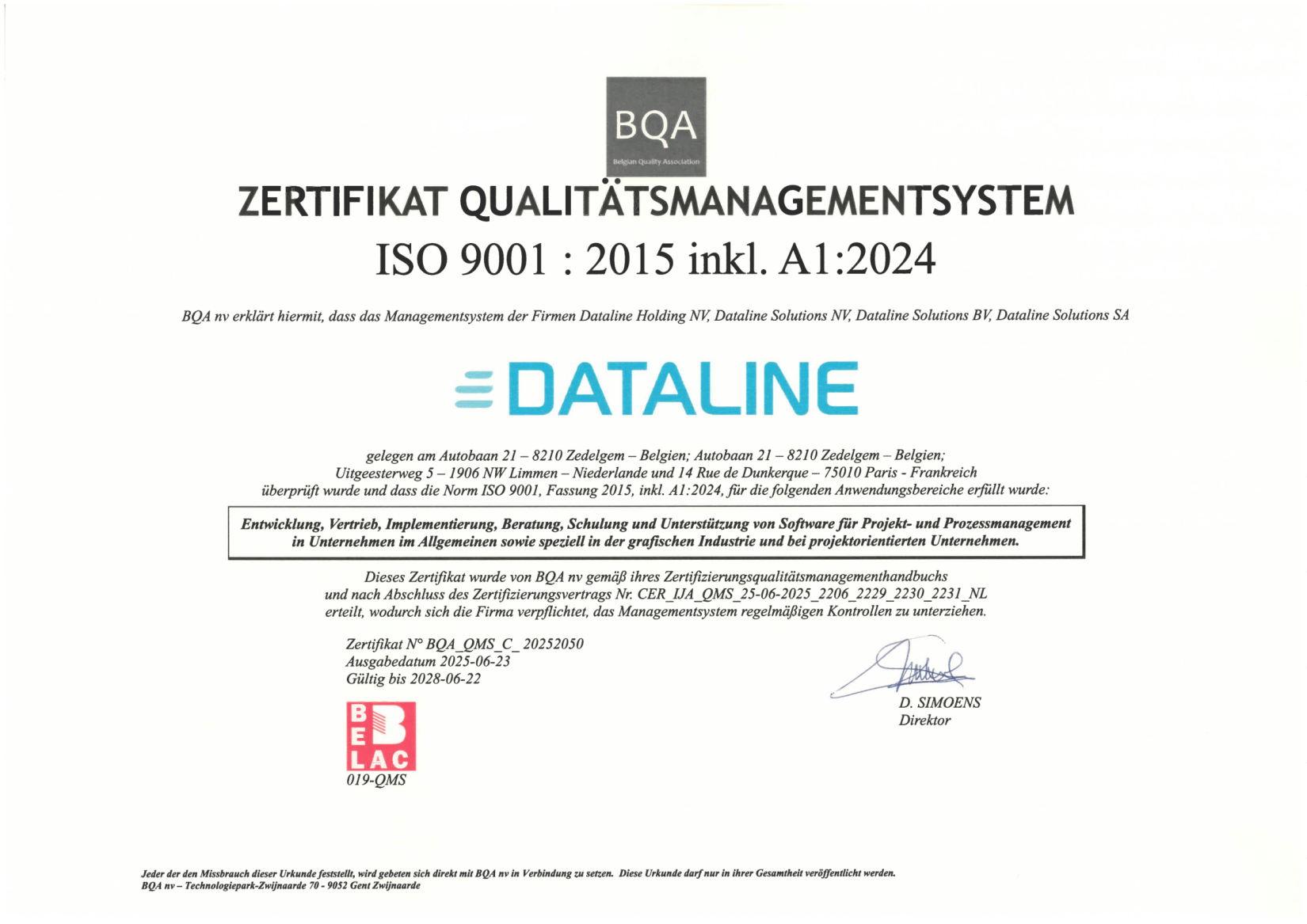 ISO 9001:2015 ist die internationale Norm für Qualitätsmanagement. Dieses Zertifikat wird nur Organisationen verliehen, die nach einer gründlichen Prüfung nachweisen können, dass die Qualität von Produkten und Dienstleistungen strukturell gesichert ist. Für Dataline bedeutet das, dass wir nach klaren Prozessen arbeiten und kontinuierliche Verbesserung als Kernprinzip pflegen.