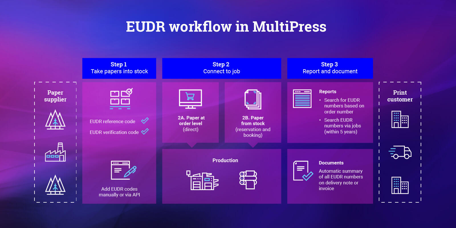 - With complete material traceability, MultiPress links each type of paper to the appropriate supplier, certification and origin information. This creates a watertight digital chain in which every order remains traceable to its origin. This makes it easy to demonstrate that raw materials meet the EUDR criteria.