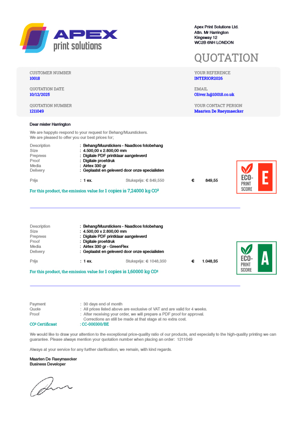 An African elephant easily weighs 4 to 7 tonnes. An impressive figure, but without comparison, quite abstract. The same goes for the CO2 emissions of printed materials. A number in kilograms per print run doesn’t say much without context. That’s why MultiPress introduces the EcoPrint Score: a visual indicator that, similar to the Nutri-Score for food or the EPC label for buildings, makes the ecological impact of a job clear using a scale from A (dark green or low environmental impact) to E (red or high environmental impact).