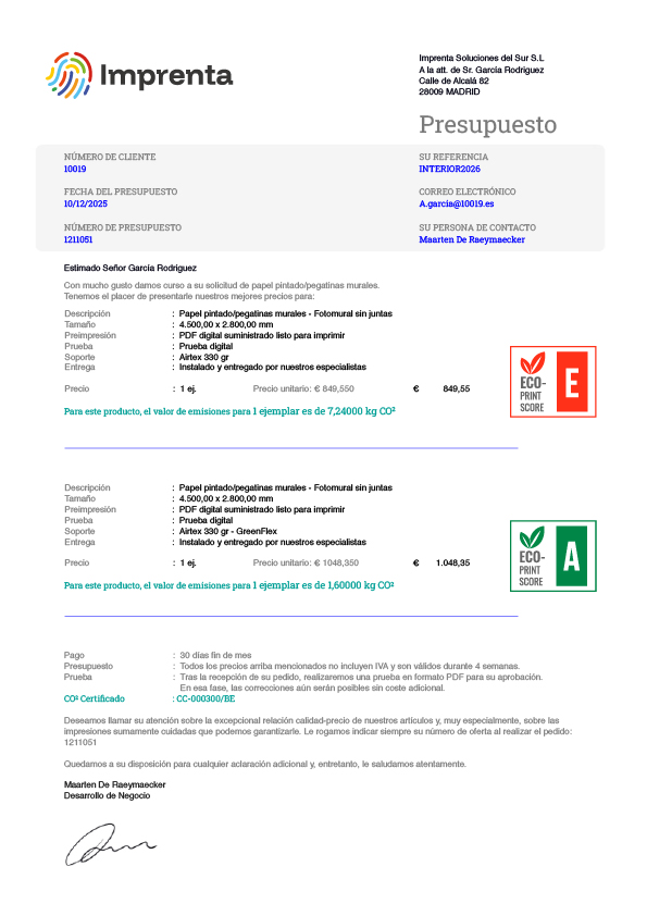 La sostenibilidad no solo es un requisito, también refuerza su reputación. La Suite CO₂ le ayuda a ser transparente sobre su rendimiento ecológico, permitiendo a clientes como Didier Gilson de Toner de Presse tomar decisiones responsables y fortalecer la relación con sus clientes.