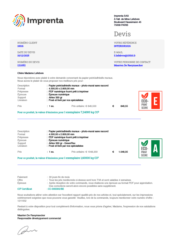 - Les émissions de CO2 sont mentionnées sur chaque document, éventuellement accompagnées d’un EcoPrint Score.