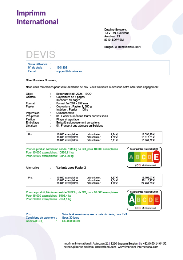 - Les émissions de CO2 sont mentionnées sur chaque document, éventuellement accompagnées d’un EcoPrint Score.